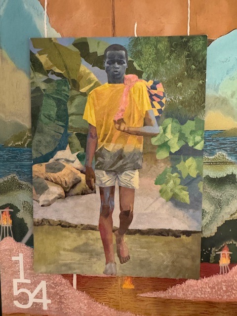 This year, there were many moments that truly stood out to me, especially the paintings and sculptures featured in the Fair. One new artist who captured my attention was David Mbuyi. With a bold and compelling point of view –Mbuyi’s work indicates a promising future that is impossible to deny. Mbuyi is a Congolese figurative painter, represented by Nathan Chiche Gallery. His oil paintings radiate with poise and depth as evidenced in the above untitled image. In this painting, a young man walks barefoot, eyes cast down and lost in his own thoughts. His stride is confident, his environment is lush with green plantain leaves that form a geometric canopy around him. This striking image evokes a sense of purpose, serenity and the ease of being immersed in one’s thoughts.